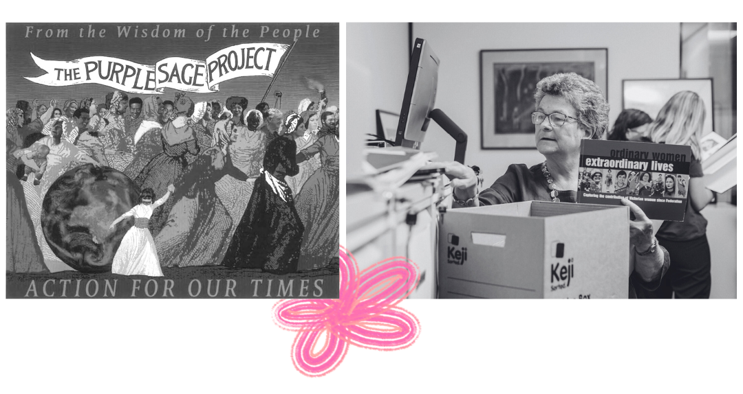 Image left: Promotional poster for The Purple Sage Project. Image right: Former VWT Executive Director Mary Crooks AO discovering the Ordinary Women, Extraordinary Lives book in the VWT archives. Image by Breeana Dunbar.